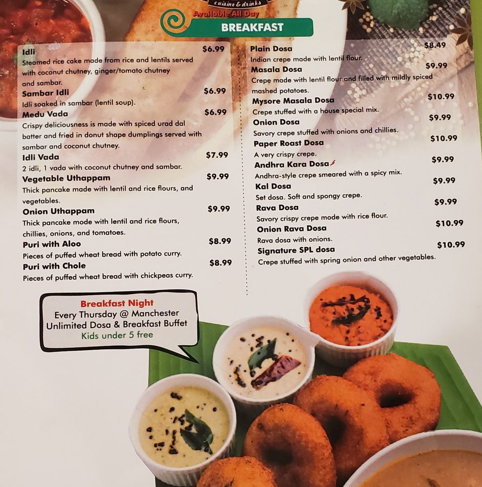 Daal, sambar and veg curry. Served with rice, tandoori naan and dessert.
