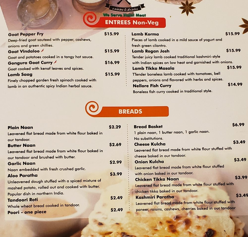 Chicken biryani and chicken curry. Served with daal and sambar, rice, naan, mirchi ka salan, raitha and dessert.